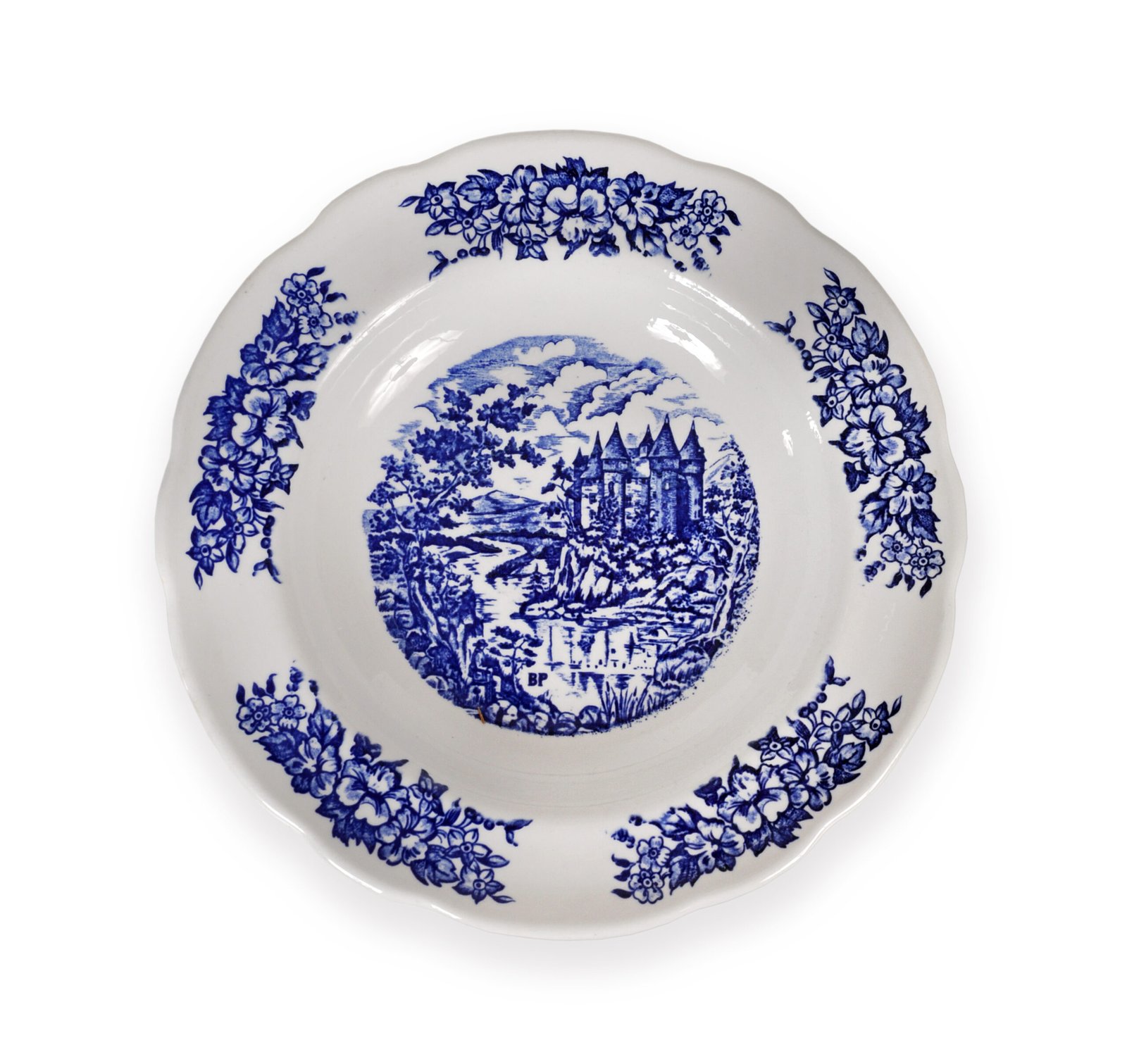 Au pays des merveilles: Assiettes plates en porcelaine Pyroblan. Elles illustrent un magnifique tableau du XIXe, avec une scène traditionnelle et une bordure florale festonnée.