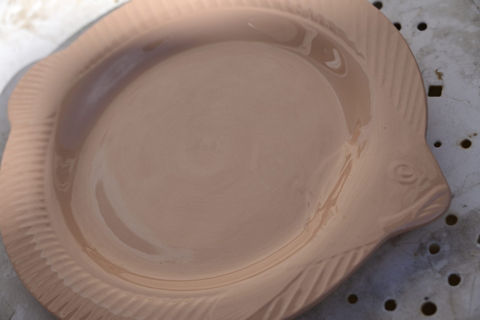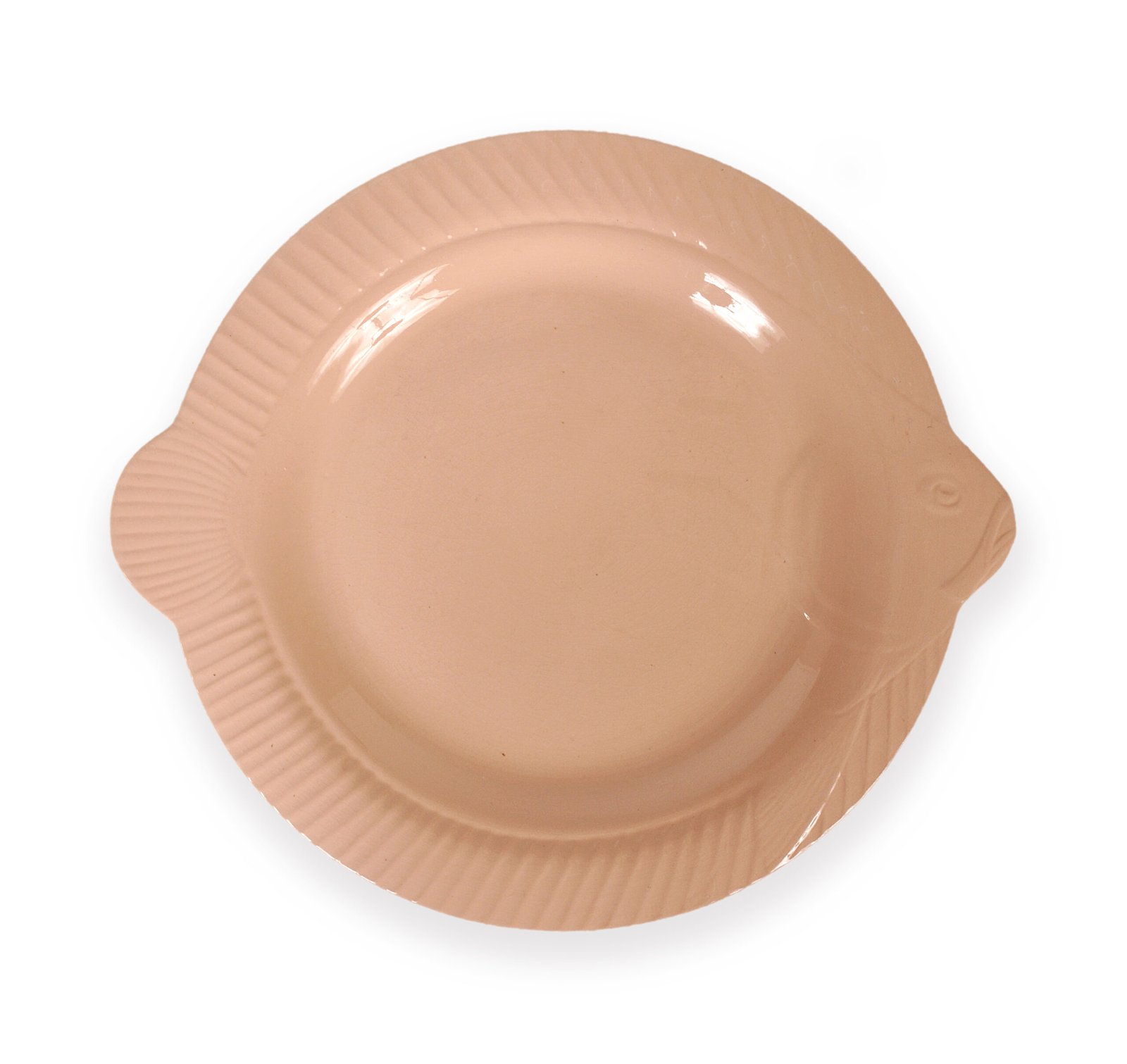 Fish & chips: Assiettes délicatement rose, forme discrète de poisson. Manufacture de Sarreguemines, fabrication française.